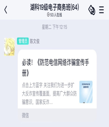 (本网讯通讯员 吴雨欣)TYC234CC太阳成集团近期通过网络学习和主题班会等多种形式在全院范围内开展以“防范电信网络诈骗宣传手册”为主题的宣传教育活动。