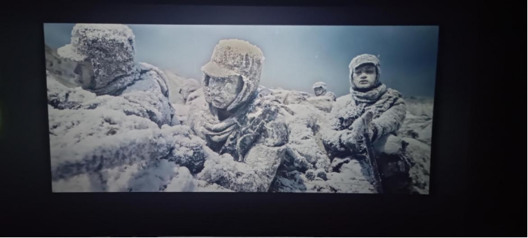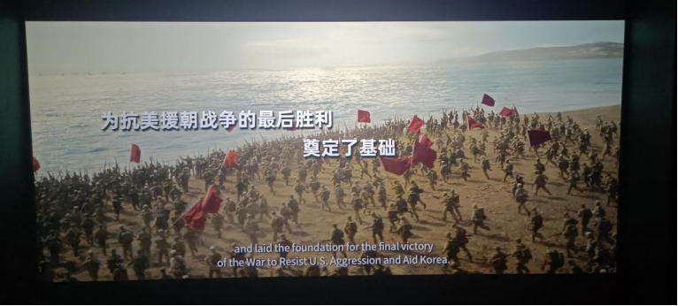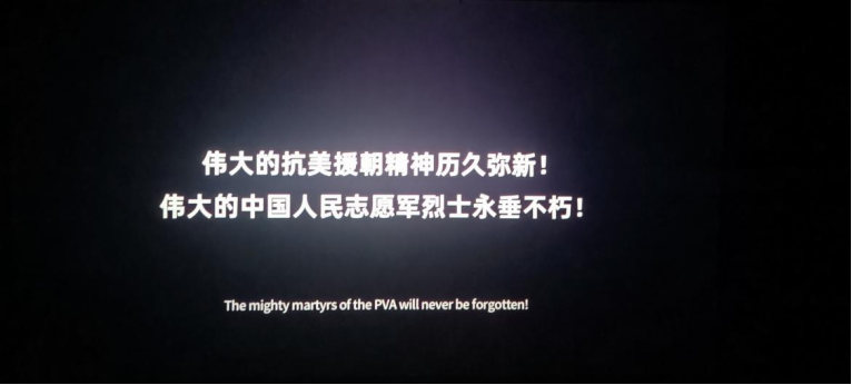 在观看过程中,所有学生都全神贯注,炮火的红光,满目残骸,大雪皑皑,飘扬的中国红,死守的阵地,饥饿寒冷,画红框的名字……种种历史中惨烈的景象呈现在学生眼中,从美军仁川登陆,悍然越过三八线进犯中朝边境,到志愿军跨过鸭绿江出国作战,抗美援朝保家卫国;从长津湖战役全线爆发,我志愿军战士重创敌人,到美军兵败后退,撤出兴南港……美军装备之强大、我志愿军斗志之昂扬,都得到了体现。抗美援朝战争中,武器装备极其落后的志愿军与武装到牙齿的美军形成了鲜明对比,但中国人民志愿军以“钢少气多”力克“钢多气少”,凭借超乎寻常的战术设计与过人的意志,逐步扭转了抗美援朝战争的局势,打出了军威国威,成为当之无愧的“步兵之王”,电影中壮烈的景象使不少学生潸然泪下。