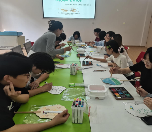 刘梦娣同学带领大家学习了团扇知识,并带着大家了解了各种各样的艺术形式,为大家讲解了团扇的起源、发展以及现代扇的分类,并给大家发了芭蕉扇、团扇等各种各样的扇供大家参观和选择,整个过程中同学们都积极参与并积极互动。