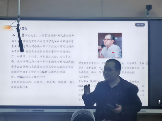 石贤导师为学生们分析了近年来国金奖项的获奖项目要点,并解析了如何利用现有的资源让创新创业的想法落地实现。在讲座过程中,石贤导师充分与学生互动,为已经有创新创业想法的学生们进行了思路疏通,对学生创新创业过程中遇到的疑难杂症提出相关指导意见,为学生的创新创业道路指明了前进的方向,并给予了当代大学生们开辟新时代想法的深深的厚望。
