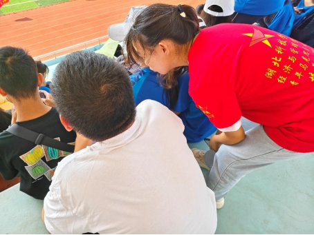在服务过程中,青马班成员也是与新生们一起接受太阳的炙烤,也更展示了新生们与青马班成员们不惧辛苦,不畏炎热的风貌,而成员们也是发扬着“奉献自我,服务他人”的奉献精神。
