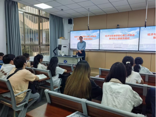 (通讯员:周通、王晶;审稿人:刘波)为加强大学生心理健康教育工作,提升心理委员的专业素养与工作能力,经管学院于2025年4月8日晚,在教2-112教室,召开经管学院2025年度心理工作例会暨心理委员培训会。学院分管学生工作党委副书记刘波、学工办全体辅导员及全院心理委员和心理工作部40余人参加本次会议。辅导员王晶负责会议主持和培训,旨在通过专题培训与交流研讨,进一步明确心理委员的职责使命,强化心理危机干预能力。