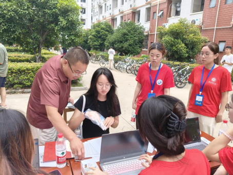 线下报到环节,学院在指定区域设置报到点,身着统一红衣的志愿者成为现场亮眼风景线。志愿者们提前到位,分工开展引导服务:在校园入口处,主动迎接新生,核对报到信息;在报到窗口前,协助新生完成材料提交、信息登记、校园卡领取等流程,同步发放包含学院手册、学习用品的迎新礼包;对携带大件行李的新生,全程陪同送至宿舍,用热情服务缓解新生初来乍到的陌生感,确保报到流程高效顺畅。