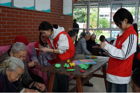 (志愿者与老人们一起折纸)