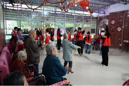 (志愿者与老人们进行手势操)