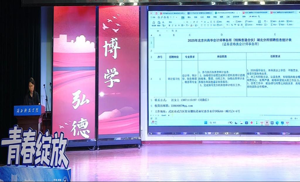 院长定光平分析了当前经济形势与就业市场格局,强调实习、就业是将专业知识转化为职场竞争力的关键过程,勉励学子秉持“经世济民”的专业初心、“自找苦吃”的担当、“起步要低”的清醒,高质量充分就业。副院长张建军详细介绍了2025、2026届毕业生基本情况、教学安排以及实习、就业意向,随后,以和乐门业集团、北京兴昌华会计师事务所(特殊普通合伙)湖北分所和珍岛信息技术有限公司为代表的企业开展宣讲,多家单位从企业文化、发展历程、岗位需求、薪资待遇、职务晋升等方面展开宣传,为毕业生答疑解惑,现场气氛热烈、井然有序。