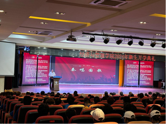 在四名活力满满的学姐精彩的开场舞后,经管学院2024级新生开学典礼拉开序幕。