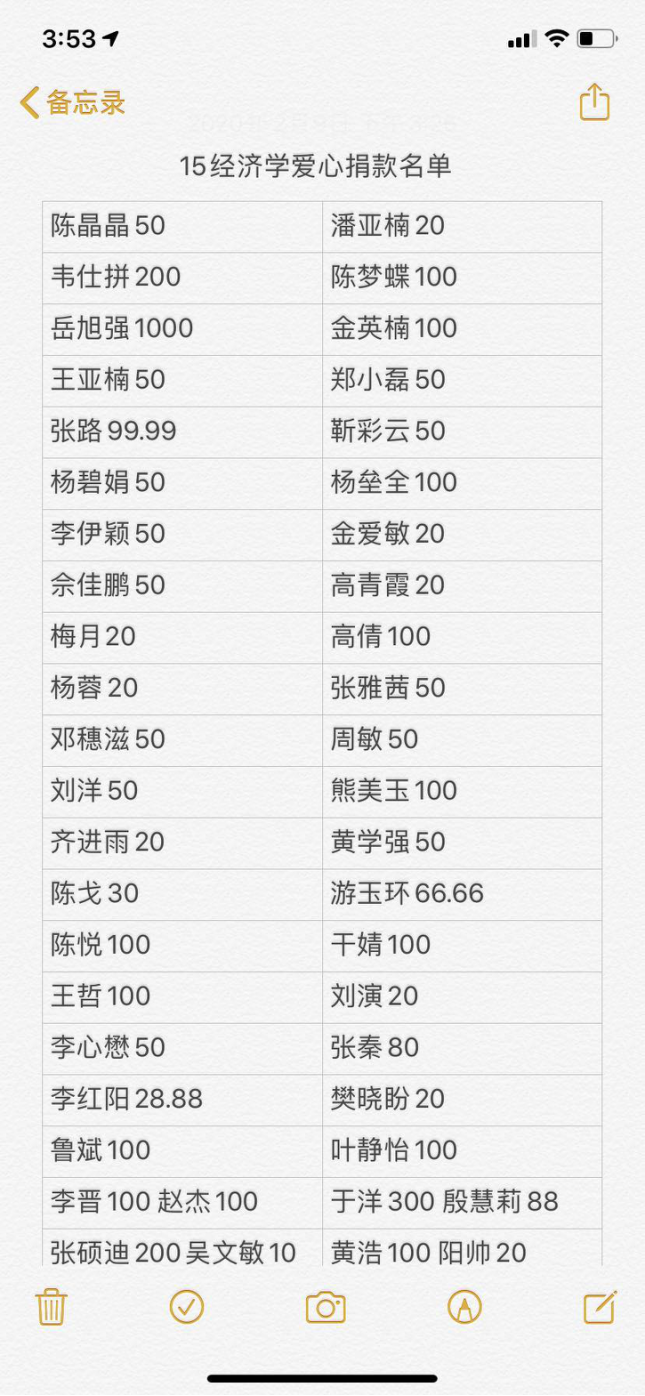 46位同学希望用绵薄之力给母校带去温暖,帮助母校挺过疫情。太阳成城集团tyc234cc15经济学46颗赤子之心与母校同在、与祖国同在!加油,咸宁!加油,湖北!加油,中国!