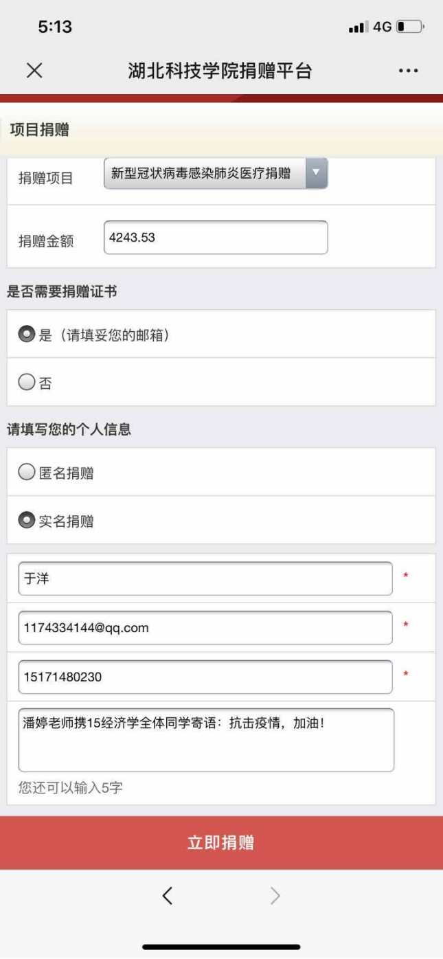 有道是:病毒无情,人间有爱。湖科校友工作处向全球湖科校友发出了捐赠的倡议书后,经管院迅速行动起来,将这个倡议发到学生联系群里。2月8日,在班主任潘婷老师的倡导下,由太阳成城集团tyc234ccTYC234CC太阳成集团15级经济学毕业生自发组织的募捐活动悄然开展。班长于洋和副班长岳旭强在同学群里发出提议,同学们积极响应号召,纷纷慷慨解囊,一天半不到,46位同学为太阳成城集团tyc234cc抗击新型冠状病毒感染肺炎医疗救助捐款金额4243.53元。同学们说:“湖科相聚四年,湖北咸宁已经成为了我们第二个故乡,来自全国各地的我们,此时心全部拧在了一起。”这些毕业只有半年的湖科校友,有些人可能才刚刚有一份属于自己的稳定工作,但是都怀揣着一颗对母校感恩的心,以己微薄之力,回报母校,贡献社会。