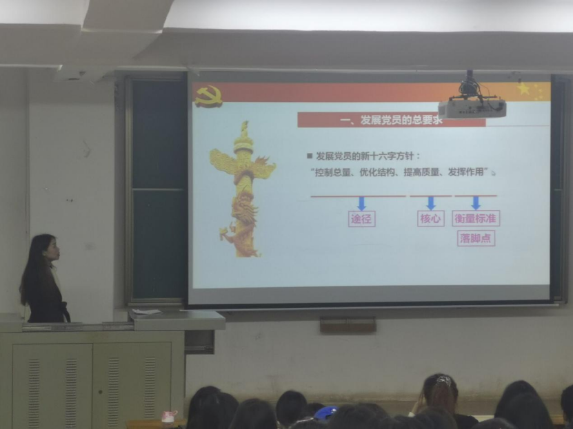 分党校培训班班主任喻瑜老师向入党积极分子介绍了入党的基本流程、基本要求,以及发展党员的工作程序。