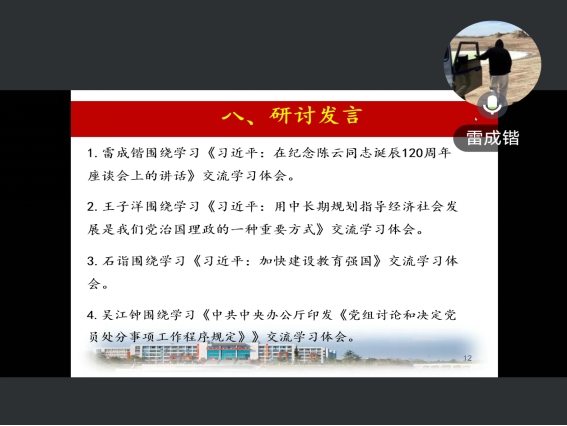 集中学习环节,四位学生党员分别领学了重要文件精神:汤可欣同志领学《习近平:在纪念陈云同志诞辰120 周年座谈会上的讲话》;张娜同志领学《习近平:用中长期规划指导经济社会发展是我们党治国理政的一种重要方式》;范灵同志领学《习近平:加快建设教育强国》;徐淦同志领学《中共中央办公厅印发〈党组讨论和决定党员处分事项工作程序规定〉》。