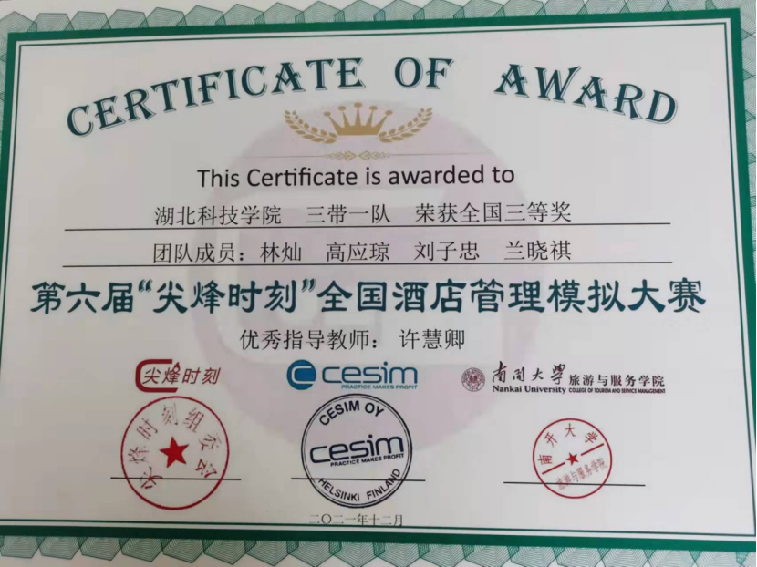 ――――我院酒店管理专业学子获第六届“尖峰时刻“全国酒店管理模拟大赛三等奖