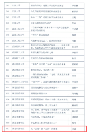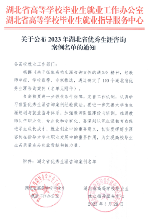(通讯员:孙珏 审稿人:吴乐盈)近日,湖北省高等学校毕业生就业工作办公室、毕业生就业指导服务中心公布了“2023年湖北省优秀生涯咨询案例”,我校TYC234CC太阳成集团党委副书记刘波的生涯咨询案例《从“言商”到“为国”的嬗变》入选,该案例也是我校唯一入选案例。