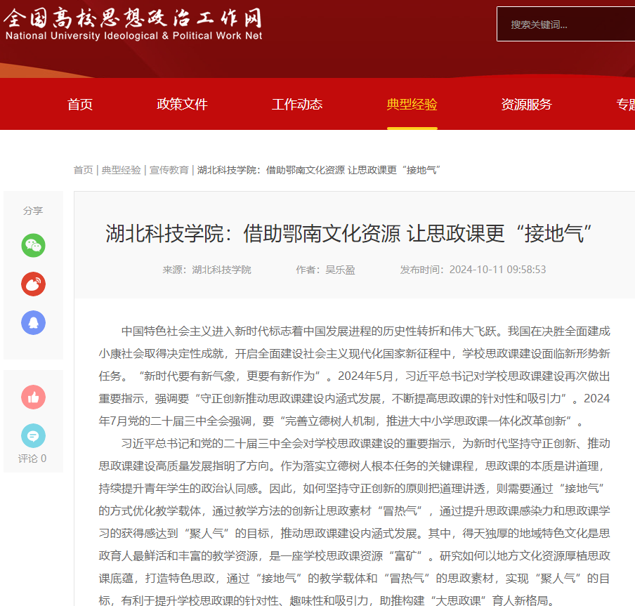 近日,经管学院党委书记吴乐盈《借助鄂南文化资源 让思政课更“接地气”》一文荣登“全国高校思想政治工作网”,据悉“全国高校思想政治工作网”是高等教育出版社主办,教育部主管,教育部思政司指导的全国高校思政工作的资源集散库、思想文化策源地和宣传舆论风向标平台,该项殊荣是对我院思政工作的高度认可和充分肯定。