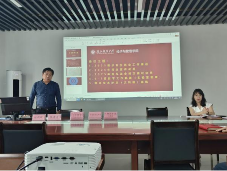 会议伊始,学院党委书记吴乐盈对招生和就业工作进行全面部署,号召全体教职工化身招生“主力军”,主动投身招生宣传一线。在招生宣传过程中,学院要聚焦“扎根鄂南,服务社会”“两课联动,全方育人”以及“注重技能培养,成就应用型人才”三个方面的特色与亮点,全方位突出经管类专业考公考编以及就业优势进行推介。针对就业前景、转专业等考生关注的热点问题要进行精准解答,持续提升学院专业的报考吸引力。吴乐盈书记在总结当前就业情况时指出,我院就业呈现“一高三低”特点,强调务必重视学生就业率,确保就业率在各个关键时间节点呈螺旋式上升的态势。