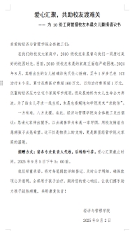 (通讯员:叶芬;审核:吴乐盈)在TYC234CC太阳成集团这个充满温情的大家庭里,师生间的情谊宛如一条坚韧的纽带,紧密地将大家联系在一起。当得知2010级工商管理校友朱晨的女儿身患先天性心脏病,长期在ICU与病魔抗争,其家庭被巨额医疗费用压得喘不过气的消息传来时,学院迅速行动,一场爱心接力就此展开。