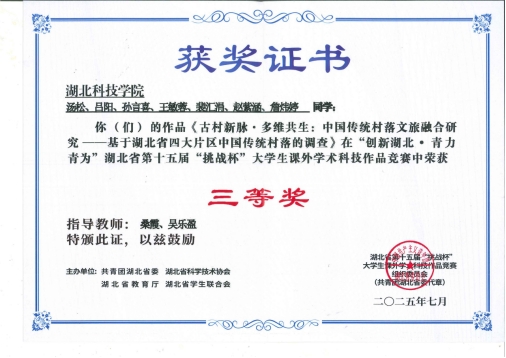 (通讯员:裴汇涓;审核人:吴乐盈)2025年11月13日,2025年“挑战杯”大学生课外学术科技作品竞赛总结表彰暨2026年“挑战杯”大学生创业计划竞赛动员部署大会在学校揽胜楼学术报告厅顺利召开。我院远方小院团队凭借《古村新脉・多维共生:中国传统村落文旅融合研究——基于湖北省四大片区中国传统村落的调查》项目,荣获省赛三等奖。