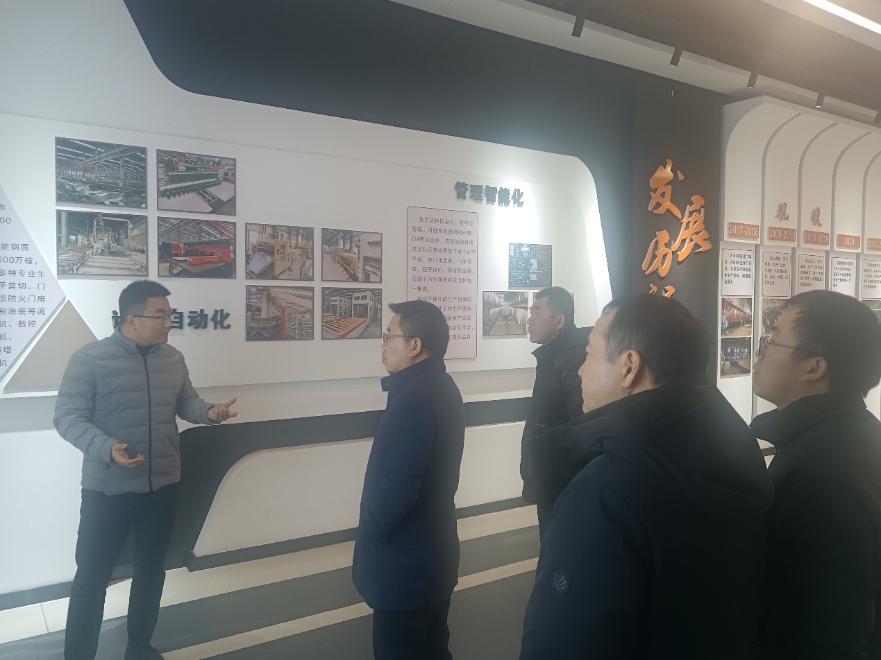 第二阶段,由蔡靖华副总经理带领全体参会人员参观和乐门业陈列馆。在蔡总亲自讲解下,对和乐门业有了较全面认识。一是产品类型多,二是生产及物流智能化,三是市场广阔,市场需求旺盛。四是企业社会责任感强,本地提供1000多人就业岗位,每年上交税收超2000万。因此,蔡总提出和乐门业一线业务部门,二线物流及生产部门,三线财务及后台客户均大量需要经管学院长期培养符合企业发展的新时代大学生。同行张建军教授充分肯定和乐门业对当地经济发展的社会价值,同时符合我院数智化转型和开门办学的发展方向,充分认可蔡总提出的与经管学院开办“和乐班”的思路,有利于实现经管学院及和乐门业共同高质量发展。全体参会成员参观和乐门业陈列馆后均表示受益匪浅。