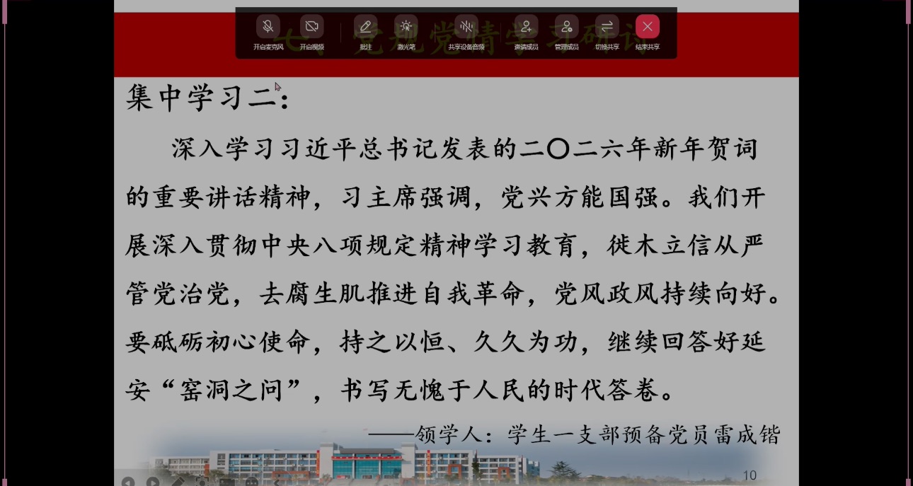在集体学习部分,肖金颜同志领学了《中共中央政治局召开民主生活会强调 锲而不舍落实中央八项规定精神 以优良作风凝心聚力真抓实干》;雷成锴同志领学了《国家主席习近平发表二〇二六年新年贺词》;张洁同志领学了《中央经济工作会议在北京举行 习近平发表重要讲话》,石诣同志、汤文慧同志、何郭丹妮同志、刘梦娣同志等都参加了集中领学。